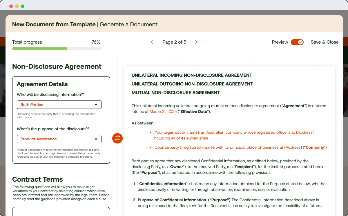 Automate repetitive, low-risk legal documents. Enable your legal team and business users to generate compliant, fully formatted legal documents by completing a guided online questionnaire.