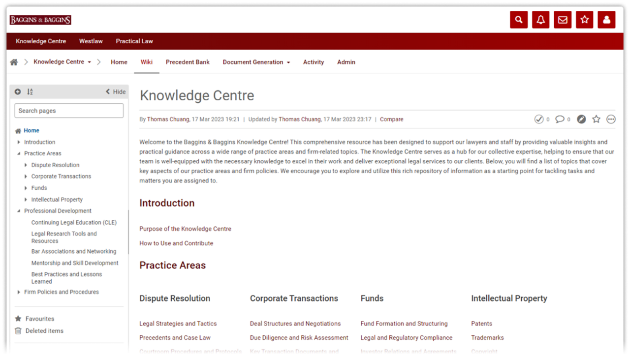- Collaborative knowledge centre: Create a centralised hub for the knowledge management team to share legal insights and resources, enhancing collaboration across the firm.