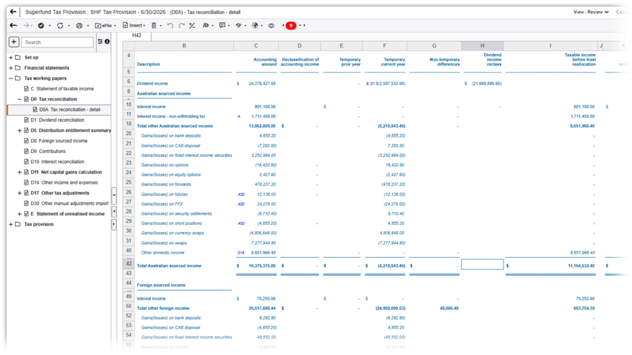 ONESOURCE Superannuation ensures reporting accuracy and quality with deliverable ready outputs such as tax reconciliation, statement of taxable income, tax journals and tax notes. Hyperlinked workpapers enhance traceability, ensuring consistent features across asset manager and owner deliverables, which supports regulatory compliance. ONESOURCE Superannuation also caters to enhanced reporting quality through the use of API’s and report format availability allowing better analytics and process automation with hyperlinked workpapers within and across each schedule.